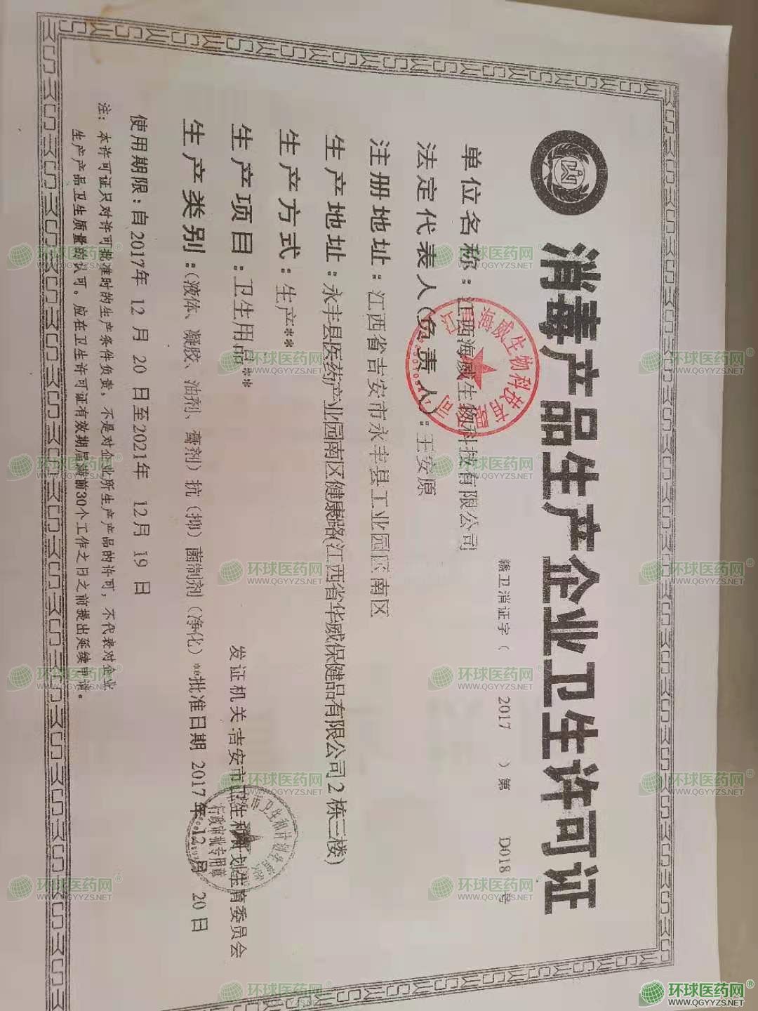 消毒产品生产企业卫生许可证