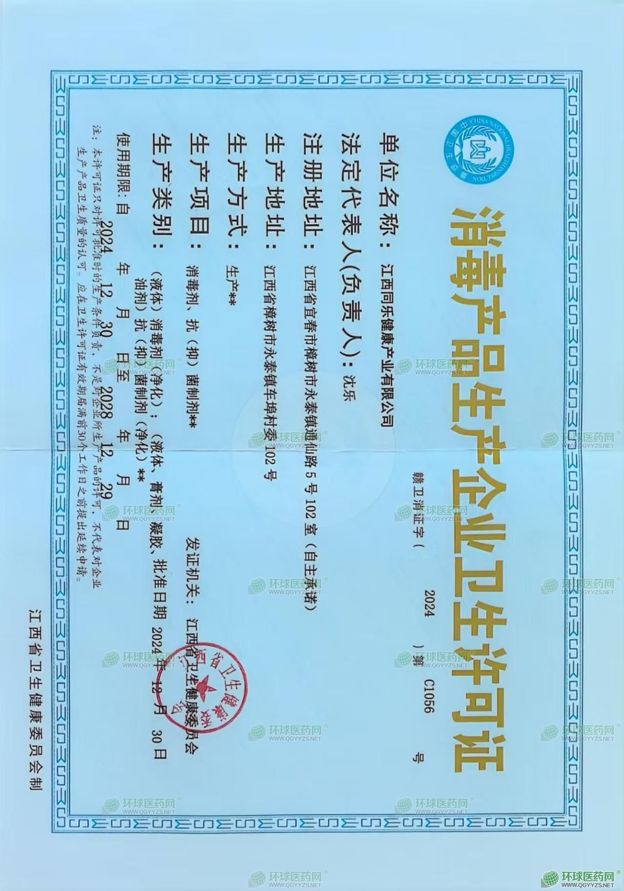 消毒产品生产企业卫生许可证