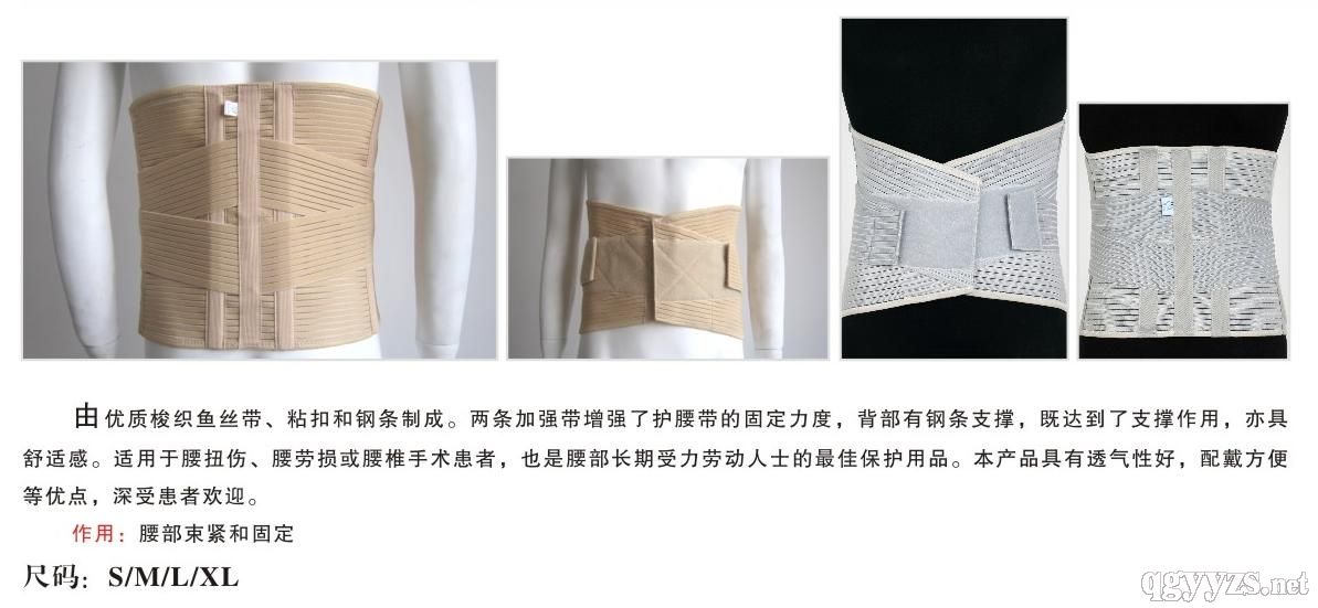 - 适用于各种腰痛病症,对腰椎骨质增生治疗、急慢性腰部损伤、腰椎间盘突出的保守治疗或手术后的腰部保护,也是腰部长期受力劳动人士的佳保护用品。