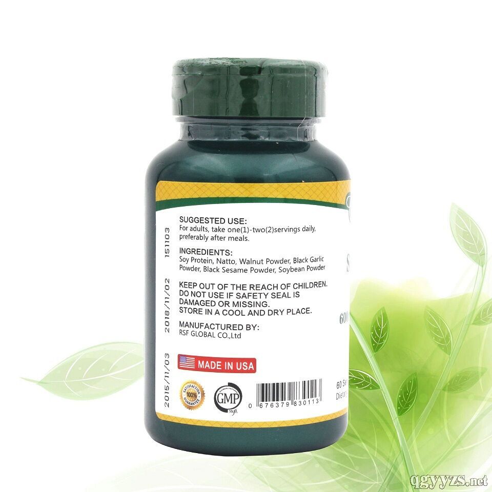- 大豆蛋白(含精氨酸250mg)、核桃仁粉、黑蒜粉、黑芝麻、黄豆粉、明胶