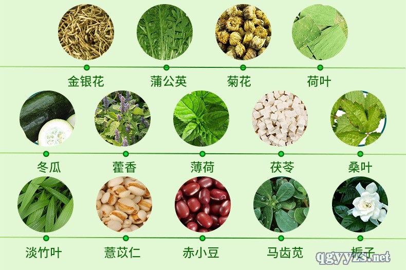 - 金银花、蒲公英、菊花、荷叶、冬瓜、藿香、薄荷、茯苓、桑叶、淡竹叶、赤小豆、薏苡仁、马齿苋、栀子、白芷