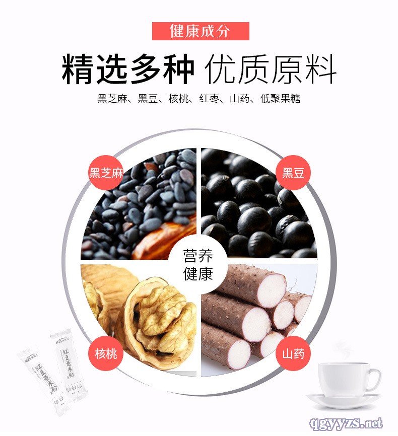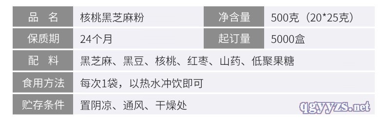 - 配料:黑芝麻、黑豆、核桃、红枣、山药、低聚果糖