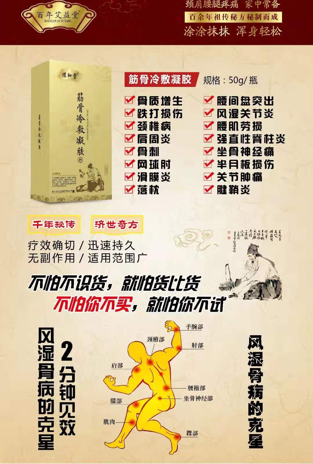 - 用于筋骨的冷敷理疗,适用于颈椎病、肩周炎、关节炎、腰椎突出增生、腱鞘炎、滑膜炎,腰肌劳损、肌肉拉伤、跌打损伤、风湿类风湿等的辅助治疗。仅用于闭合性软组织。