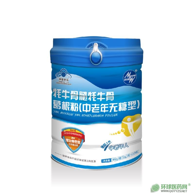 - 本品是以牦牛骨髓粉、牦牛骨粉、葛根粉、酪蛋白磷酸肽、甜菊糖苷、低聚异麦芽糖、麦芽糊精、脱脂奶粉为主要原料制成的保健食品,经动物功能试验证明,具有增加骨密度的保健功能。每100g含:钙1.52g、葛根素7.84mg
