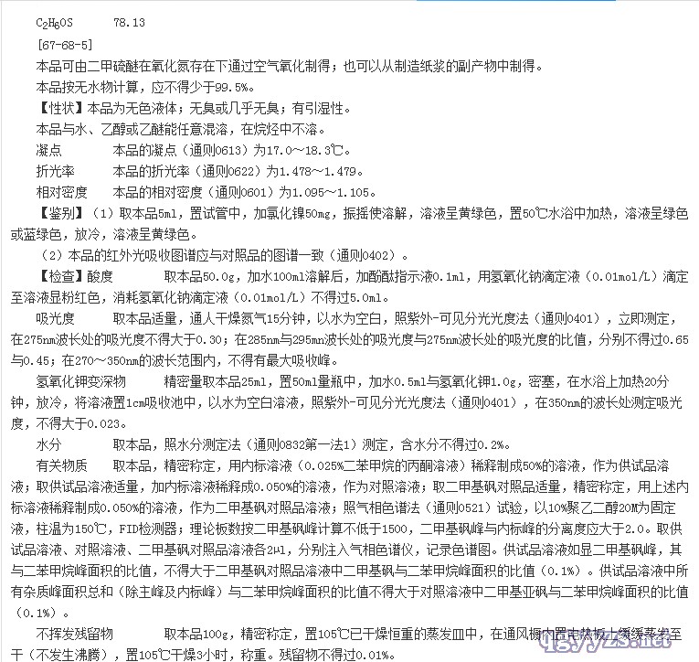 - 二甲基亚砜是一种既溶于水又溶于有机溶剂的极为重要的非质子极性溶剂。广泛用作溶剂和反应试剂,具有很高的选择抽提能力。二甲基亚砜本身有消炎止痛,利尿,镇静等作用,在医药工业中可以直接用作某些药物的原料及载体。有"万灵药"之称,常作为止痛药物的活性组分添加于药物之中。