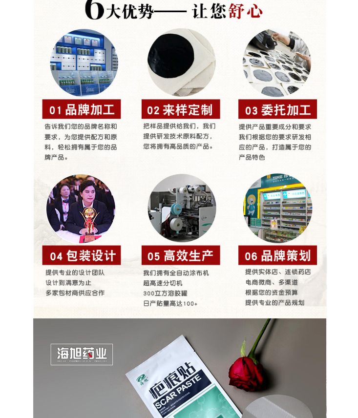 - 海旭疤痕贴多省高价中标、严格市场保护,操作简单,市场需求量大,诚邀您的加盟,确保您的膏药代加工产品安心上市!