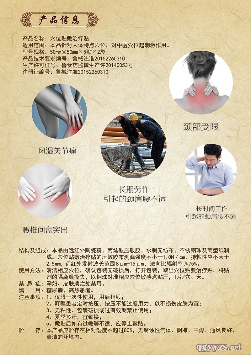 - 贴敷时间:一般成人8-10小时,儿童4-6小时。根据个体差异,贴敷时间也可以做适当调整。贴敷期间,慎食辛辣、海鲜、羊肉、蘑菇等食物。