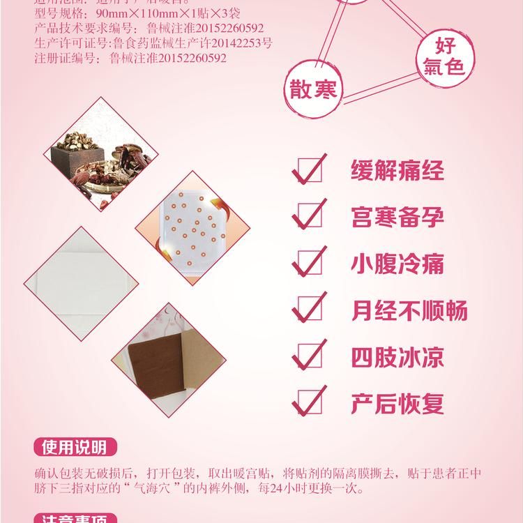 - 确认包装无破损后,打开包装,取出暖宫贴,将贴剂的隔离膜撕去,贴于患者下腹正中脐下三指对应的“气海穴”的内裤外侧,每24小时更换一次,流产连续使用5~10天;顺产连续使用10~15天;剖宫产连续使用15~20天。