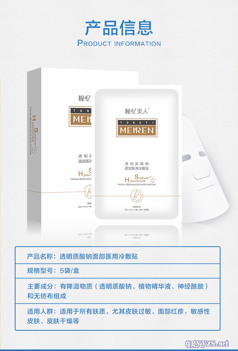 - 医美面膜 用于面部激光,光子嫩肤,果酸活肤术,皮肤过敏,面部红疹,面部色素沉着班,季节性皮肤干燥,轻度日晒伤,敏感性皮肤,激素依赖性皮炎等的物理退热。