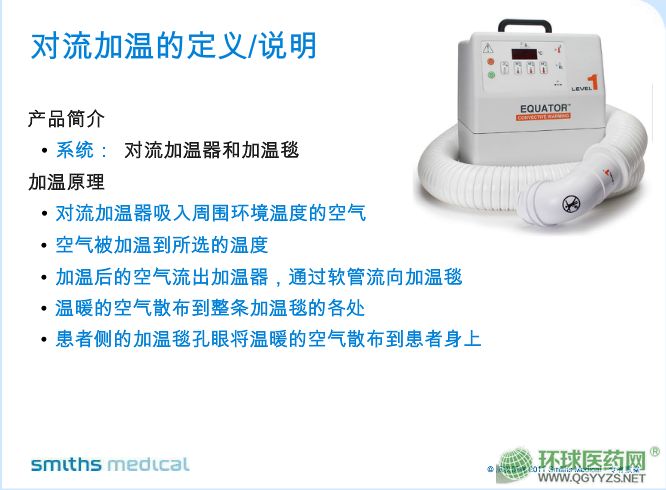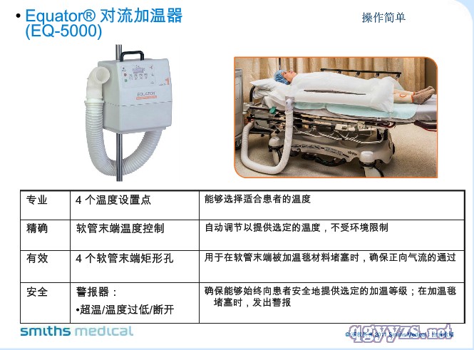 - **。使用便捷。EEQUATOR®对流加温系统设计简洁,具有可控的对流加温功能。本产品拥有专利温控系统能确保满足治疗所需的设置,高性能空气过滤网将热量分散至温毯各个部分。SnuggleWarm®温毯柔软、有弹性、耐用,适用于各种临床应用,包括各种治疗中的部分或全身加温。