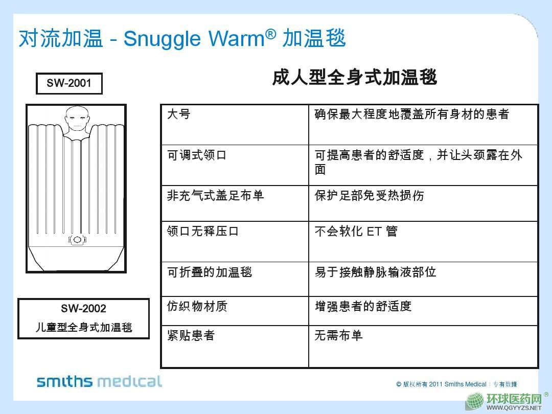 - 拥有专利温控系统能确保满足治疗所需的设置,高性能空气过滤网将热量分散至温毯各个部分。SnuggleWarm®温毯柔软、有弹性、耐用,适用于各种临床应用,包括各种治疗中的部分或全身加温