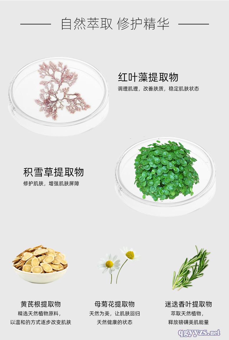 - 产品蕴含烟酰胺、燕麦、库拉索芦荟叶汁、赤鲜醇、积雪草提取物、虎杖提取物、黄芩提取物、茶叶提取物、光果苷草提取物、母菊花提取物、迷迭香提取物、红叶藻提取物等植物成份,保湿效果很好,可以增强皮肤的保水性,提高肌肤的湿度,从而让肌肤变得更加水嫩,海藻能去皱,海藻一般是在海滩浅水水域生长的一种海洋植物,主要用来制成具有凝胶剂作用的海藻胶。增加皮肤的紧致及弹性,让松弛皮肤恢复年轻的状态,从而起到去除皱纹的作用
