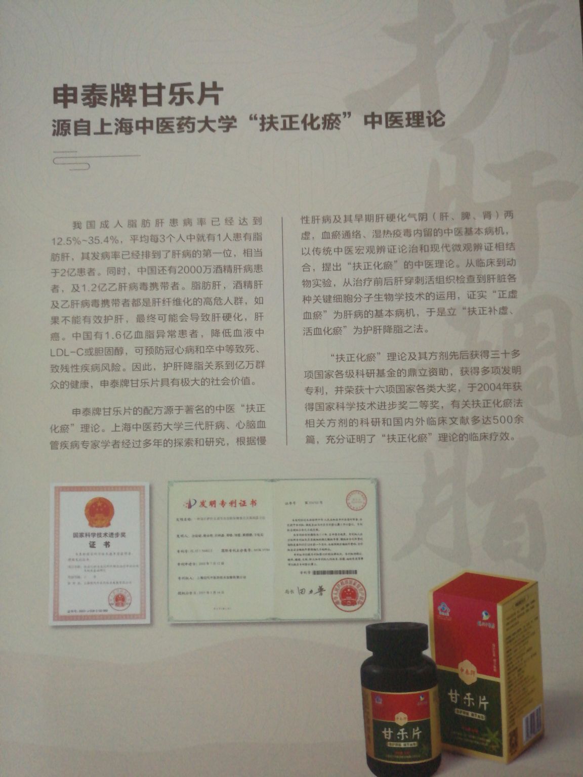 申泰牌甘乐片配方源于扶正化瘀理论。扶正化瘀理论及其方剂先后三十多项国家各级科研基金的鼎力资助,获得多项发明专利,并荣获十六项国家各类大奖,于2004年获得国家科学技术进步二等奖。