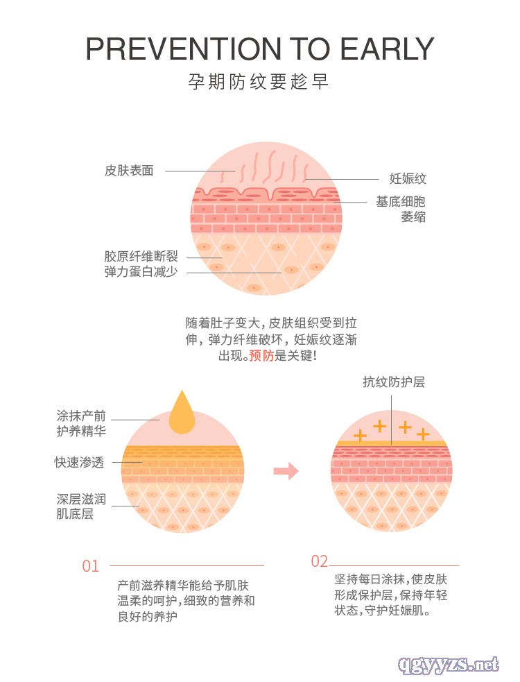 - 洁肤后,取适量涂抹于腹部、大腿、臀部等易产生妊娠纹或干燥的部位,稍加按揉至吸收即可。