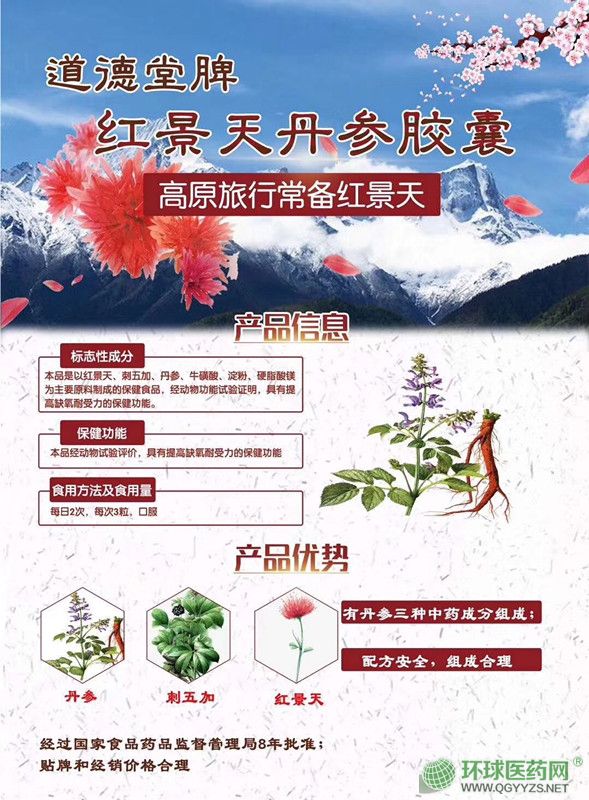 本品是以红景天刺五加、丹参、牛磺酸、淀粉、硬脂酸镁为主要原料制成的保健食品,经动物功能试验证明,具有提高缺氧耐受力的保健功能。