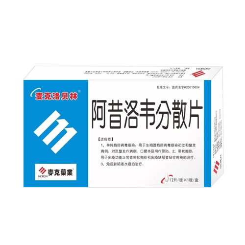 【药代动力学】口服吸收差,约15*~30*由胃肠道吸收。进食对血药浓度影响不明显。能广泛分布至各组织与体液中,包括脑、肾、肺、肝、小肠、肌肉、脾、乳汁、子宫、阴道粘膜与分泌物、脑脊液及疱疹液。在肾、肝和小肠中浓度高,脑脊液中浓度约为血中浓度的一半。药物可通过胎盘。每4小时口服200mg和400mg,5天后的血药峰浓度(Cmax)分别为0.6mg/L和1.2mg/L。本品蛋白结合率低(9*~33*)。在肝内代谢,主要代谢物占给药量的9*~14*,经尿排泄。血消除半衰期(tl/2β)约为2.5小时。肌酐清除率50~80ml/**和15~50ml/**时,血消除半衰期(tl/2β)分别为3.0小时和3.5小时。无尿者的血消除半衰期(tl/2β)长达19.5小时,血液透析时降为5.7小时。本品主要经肾由肾小球滤过和肾小管分泌而排泄,约14*的药物以原形由尿排泄,经粪便排泄率低于2*,呼出气中含微量药物。血液透析6小时约清除血中60*的药物。腹膜透析清除量很少。