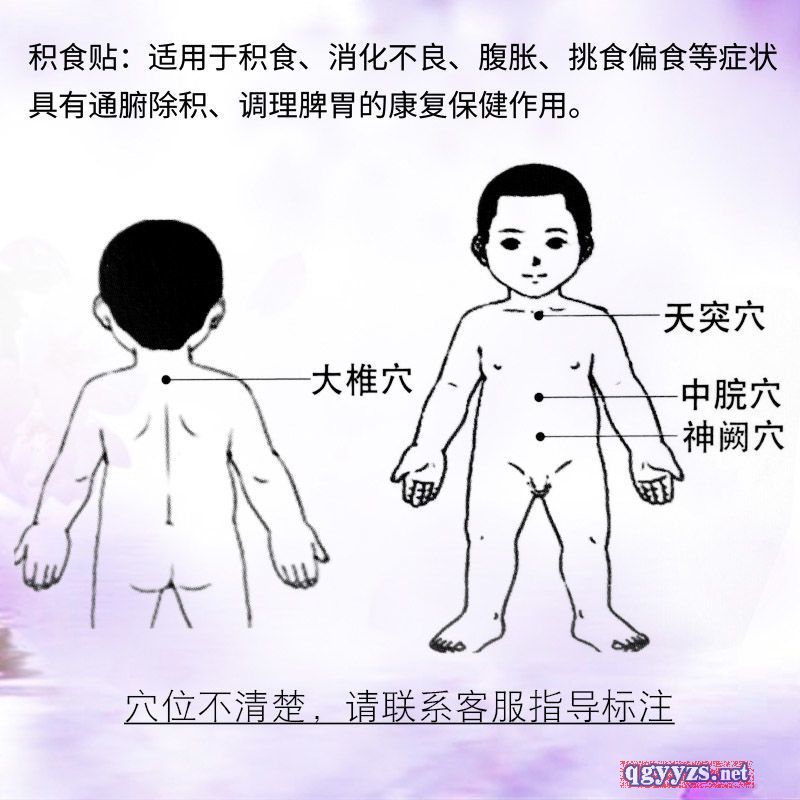 - 积食贴:适用于积食、消化不良、腹胀、挑食偏食等症状具有通腑除积、调理脾胃的康复保健作用。