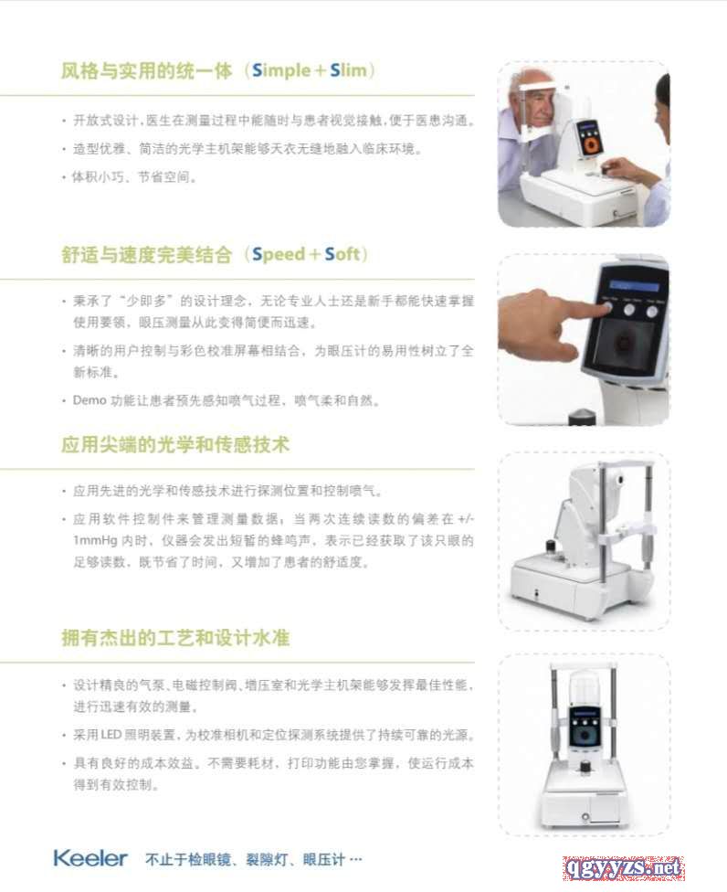 - 非接触台式眼压计4S—芯经典 型时尚Simple — 结构优化、操作简捷Slim — 开放式设计、造型优雅Speed — 更短学习曲线、更快检测速度Soft — 医患沟通轻松、喷气柔和自然 风格与实用的统一体(Simple+Slim)• 开放式设计,医生在测量过程中能随时与患者视觉接触,便于医患沟通。• 造型优雅、简洁的光学主机架能够天衣无缝地融入临床环境。• 体积小巧、节省空间。舒适与速度完美结合(Speed+Soft)• 秉承了“少即多”的设计理念,无论专业人士还是新手都能快速掌握使用要领,眼压测量从此变得简便而迅速。• 清晰的用户控制与彩色校准屏幕相结合,为眼压计的易用性树立了全新标准。• Demo 功能让患者预先感知喷气过程,喷气柔和自然。应用**的光学和传感技术• 应用先进的光学和传感技术进行探测位置和控制喷气。• 应用软件控制件来管理测量数据;