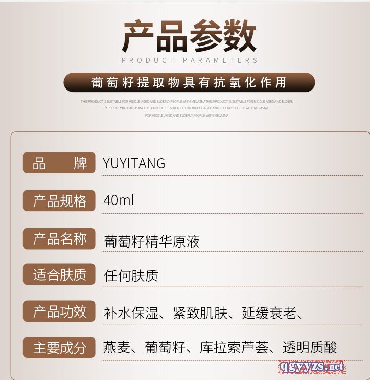 - 葡萄籽提取物具有抗氧化的作用,能够保护结构组织不被自由基破坏,从而起到延缓衰老的作用,加上含天然补水成分透明质酸,自然界保湿型很好筋质,携节丰富的水分,使面部皮肤光滑,紧致神性
