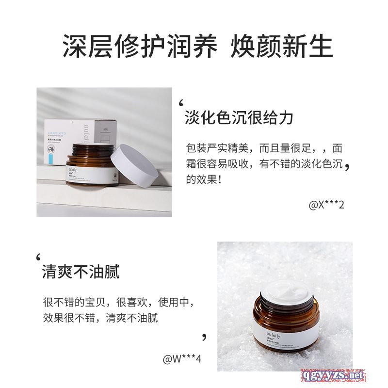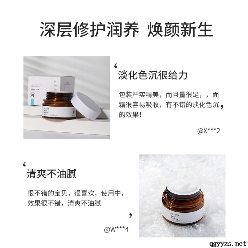 - 葡萄籽提取物具有抗氧化的作用,能够保护结构组织不被自由基破坏,从而起到延缓衰老的作用,加上含天然补水成分透明质酸,自然界保湿型很好筋质,携节丰富的水分,使面部皮肤光滑,紧致神性,
