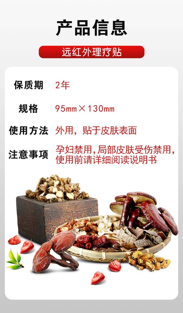 - 远红外理疗贴运用远红外疗+药疗的治疗手段,对颈椎病、肩周炎、骨质增生、腰椎间盘突出、风湿关节炎、跌打损伤起辅助治疗的作用。