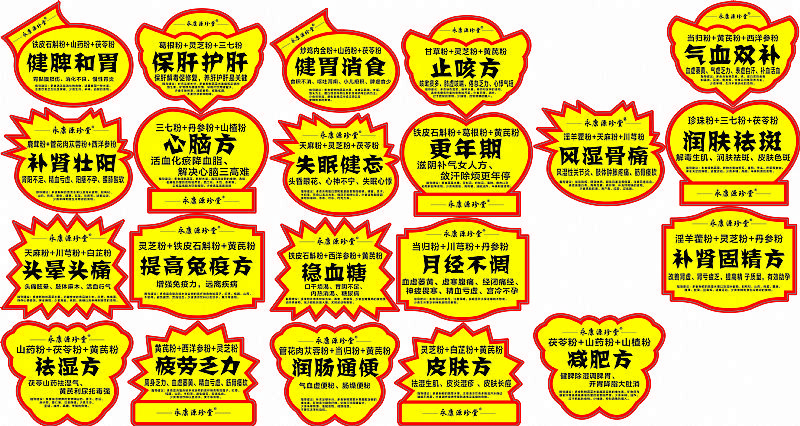 5、产品优势:医药连锁**系列产品20个,21个常见疾病关联组方。提供物料:爆炸卡,手提袋,图册,员工手册,组方海报等