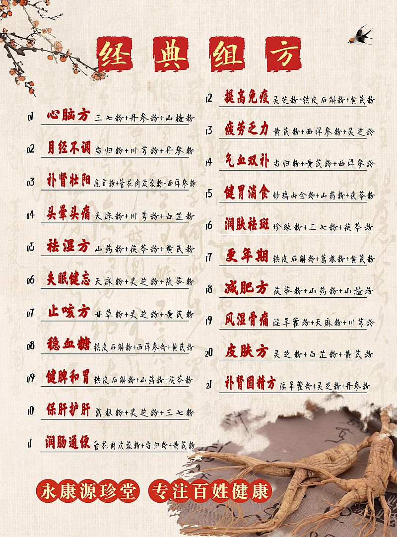 - 产品共有20个,分别包括:白芷粉、炒鸡内金粉、丹参粉、甘草粉、黄芪粉、鹿茸粉、肉苁蓉粉、三七粉、山楂粉、天麻超细粉、西洋参粉、珍珠粉、淫羊藿粉、当归粉、灵芝粉、山药粉、茯苓粉、葛根粉、川芎粉、铁皮石斛粉。