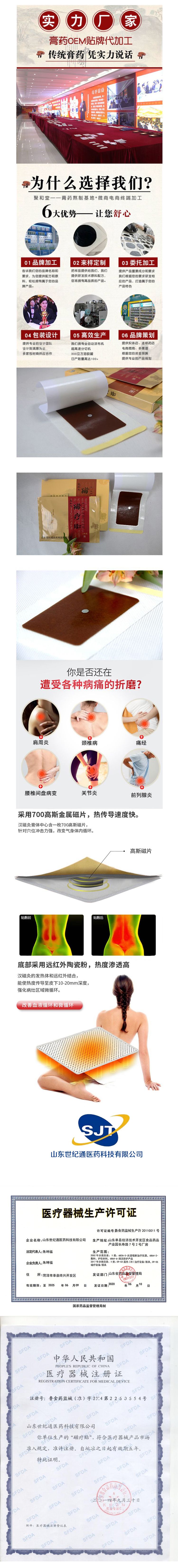 - 山东世纪通医药科技有限公司主要生产妇科、儿科、骨科、退热贴、理疗贴、磁疗贴、臭氧化油、皮肤软膏、喷剂、拔罐液等产品。可承接大小膏药产品贴牌加工,产品为*新独立一、二类器械文号、多省高价中标、国家医保收费、严格市场保护、厂家直供,利润可观!