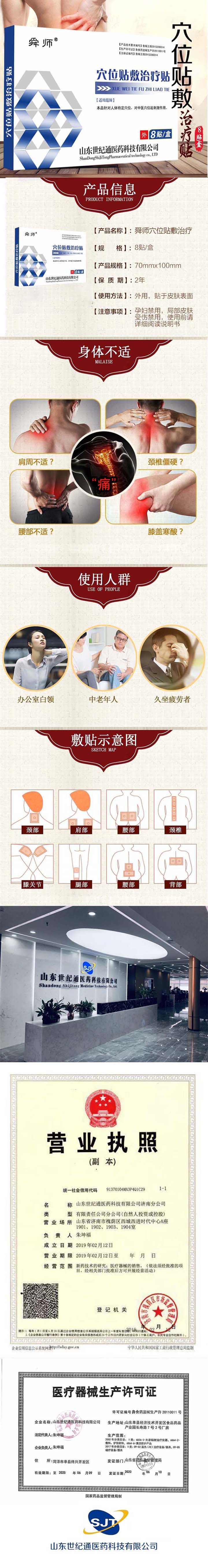 - 山东世纪通医药科技有限公司承接【械字号、妆字号、消字号、保健食品、日用品】贴膏贴剂、粉包、足浴包、泡浴包、足贴、穴位贴、理疗贴、磁疗贴、医用冷敷贴、乳膏、疼痛乳膏、液体、喷剂、艾灸液、凝胶,面膜、固体饮料、压片糖果等各种剂型产品,可以贴牌代加工,诚招全国各地代理商,提供商标注册、专利申请、版权申请等,合作共赢一条龙服务厂部热线:18888366188(微信同号)