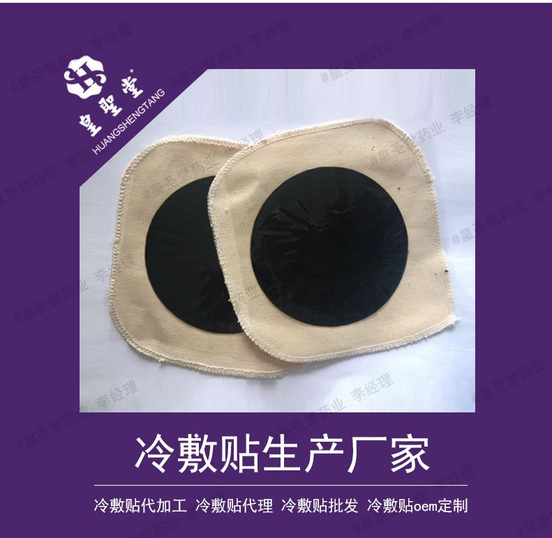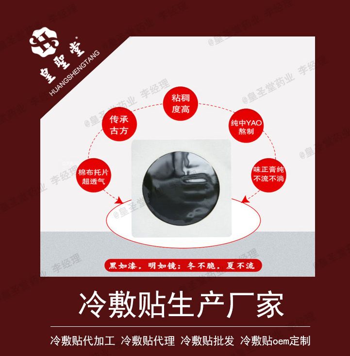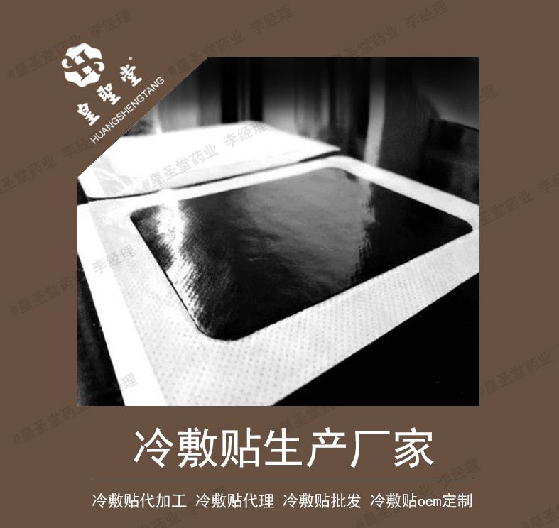 皇圣堂生产的冷敷贴能够作用于皮肤、筋骨、关节等处、除湿、止痛、宣痹通络。适用于跌打损伤、腰腿疼痛、肩周炎、坐骨、关节、颈椎疼痛、骨质增生及引起德各种疼痛具有的作用。公司还有其他各种膏药贴剂可贴牌定制,各种贴剂、凝胶药膏、液体敷料均可贴牌加工,来料灌装等多种合作方式。
