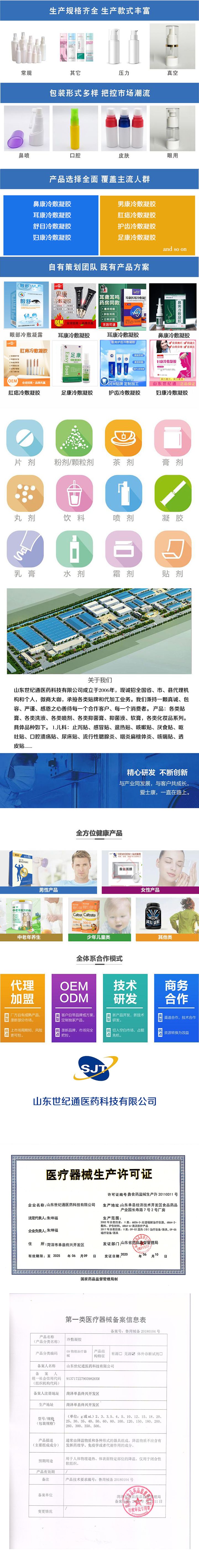 - 山东世纪通医药科技有限公司主要生产妇科、儿科、骨科、退热贴、理疗贴、磁疗贴、臭氧化油、皮肤软膏、喷剂、拔罐液等产品。可承接大小膏药产品贴牌加工,产品为*新独立一、二类器械文号、多省高价中标、国家医保收费、严格市场保护、厂家直供,利润可观!