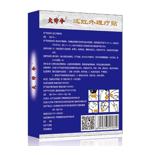 - 清洁患处,确认包装无破损后,打开包装,取出远红外理疗贴,将贴剂的隔离膜撕去,贴于患处,每24小时更换一次。