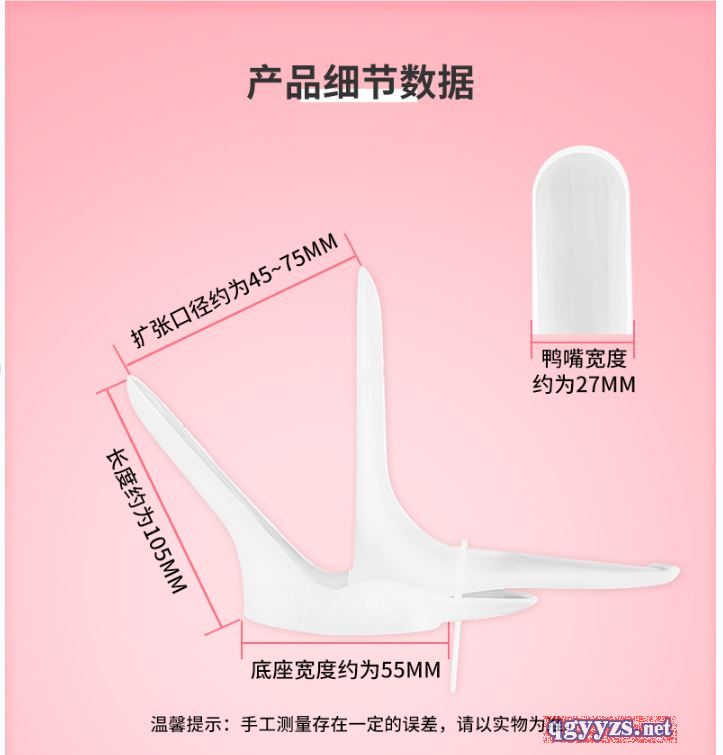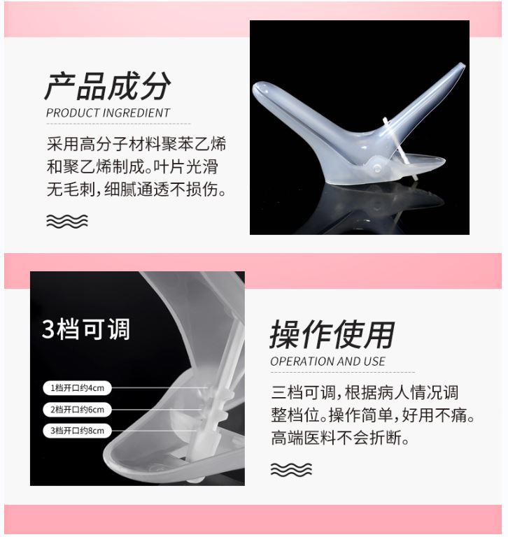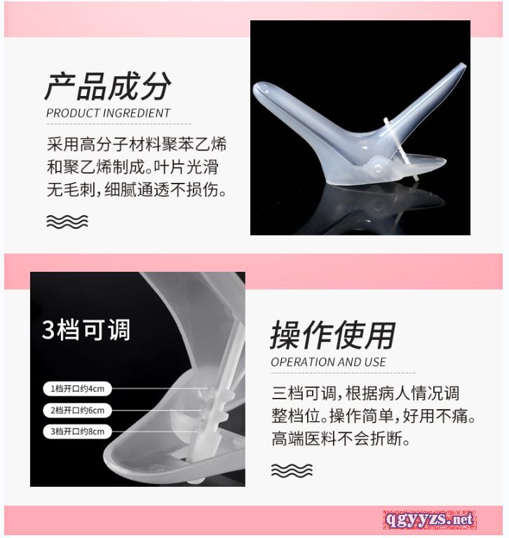 - 该产品为两件式结构,扩张器由上叶、下叶、手柄和固定杆组成。采用高分子材料聚苯乙烯和聚乙烯制成。