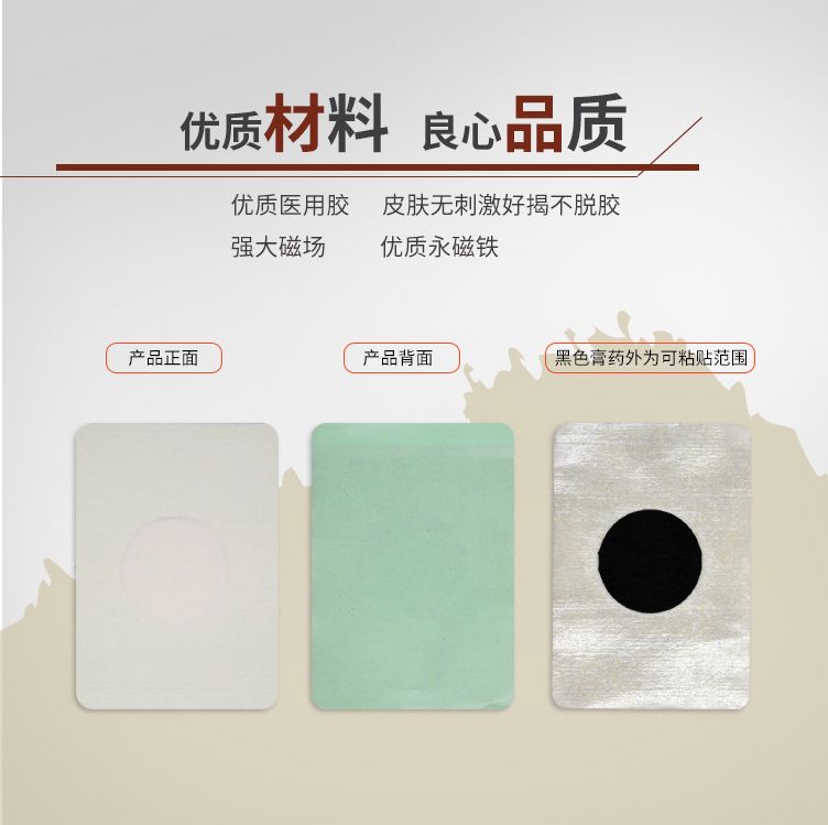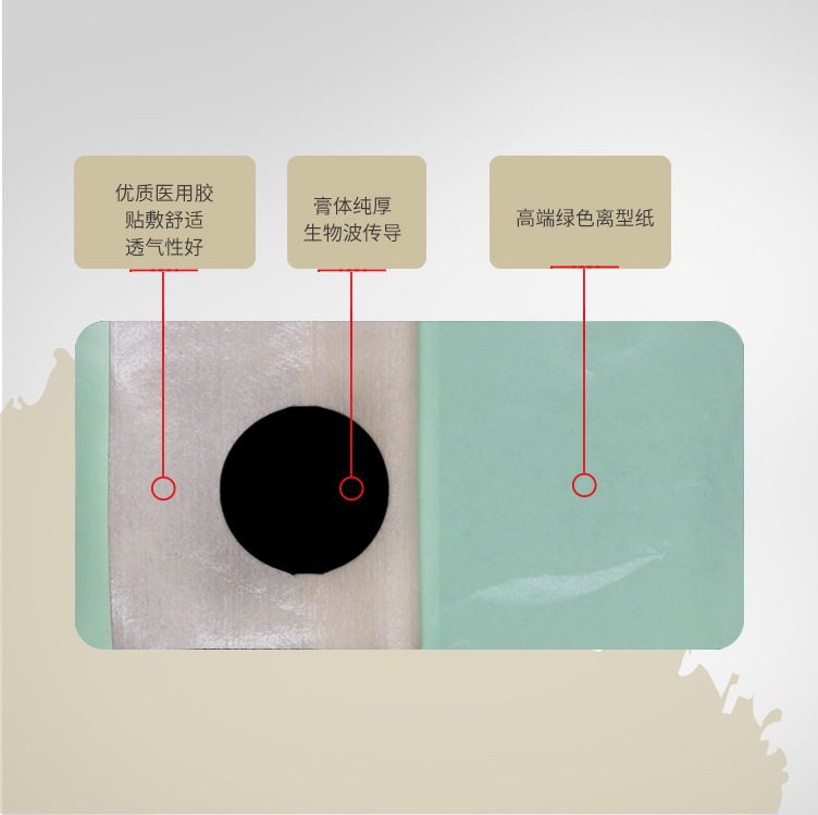 - 由治疗膏(远红外陶瓷粉和医用胶构成)、医用胶布、保护膜(离型纸)组成。