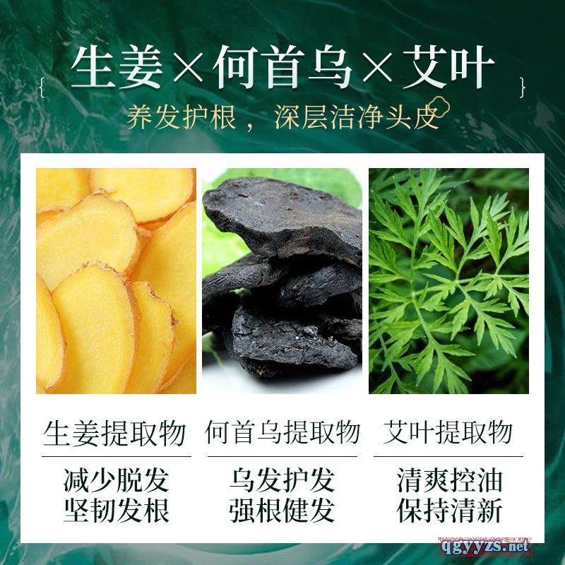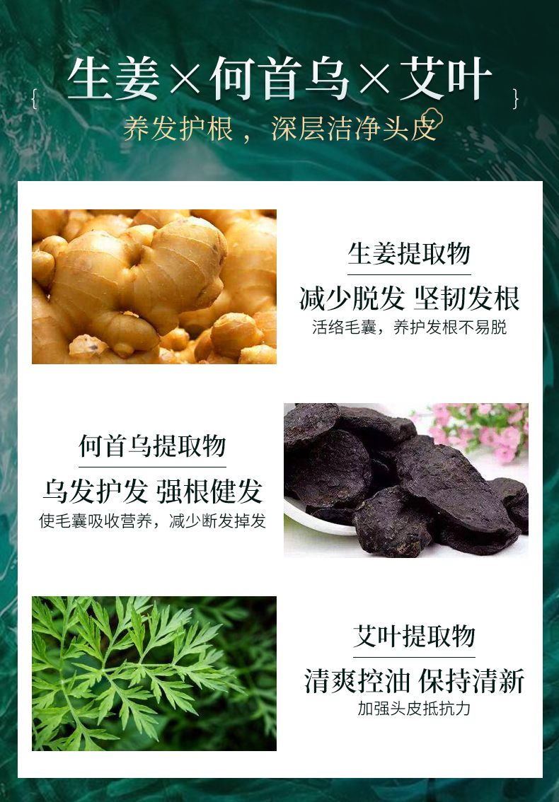 - 花椒果、柚果、艾叶、牡丹籽油、人参、生姜、何首乌、菟丝子