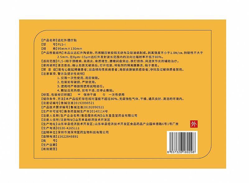- 本品由远红外陶瓷粉、丙烯酸压敏胶和无纺布及硅油纸制成。剥离强度不小于1.0N/cm,持粘性应不大于2.5mm、在8μm-15μm远红外发射波长范围内的法向比辐射率不低于80%