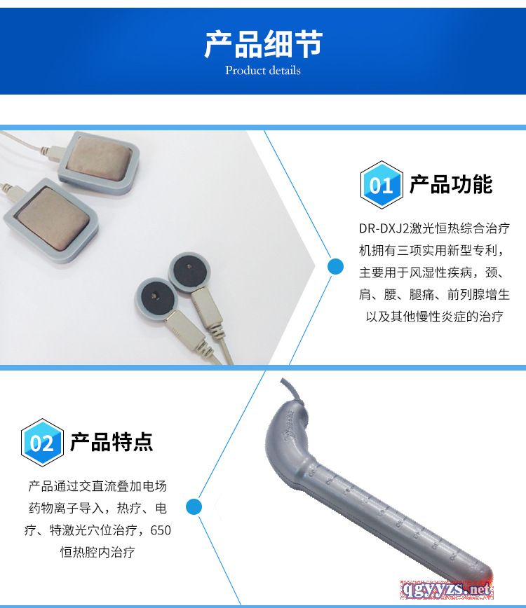 - 电疗,药物离子导入治疗,650特激光穴位治疗,650特激光恒热腔内探头;激光恒热综合治疗机主要是用于治疗慢性咽喉炎及风湿性疾病、颈、肩、腰、腿痛等肌肉劳损的治疗、骨质增生、前列腺增生及其它慢性炎症。