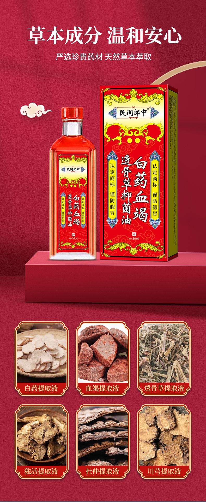 - 白药提取液、血竭提取液、透骨草提取液、独活提取液、杜仲提取液、川营提取液、当归提取液、细辛提取液、艾叶油、丁香油、冰片、薄荷脑、甘油、醋酸氯己定