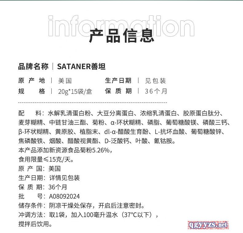 配料:水解乳清蛋白粉、大豆分离蛋白、浓缩乳清蛋白、胶原蛋白肽分、麦芽糊精、中链甘油三酯、菊粉、a-环状糊精、磷脂、葡萄糖酸镁、磷酸三钙、3-环状糊精、黄原胶、植脂末、dl-a-醋酸生育酚、L-抗坏血酸、葡萄糖酸锌、焦磷酸铁、烟酸、醋酸视黄酯、D-泛酸钙、叶酸、氰钴胺。本产品添加新资源食品菊粉5.26*,食用限量≤15克/天。原产国:美国