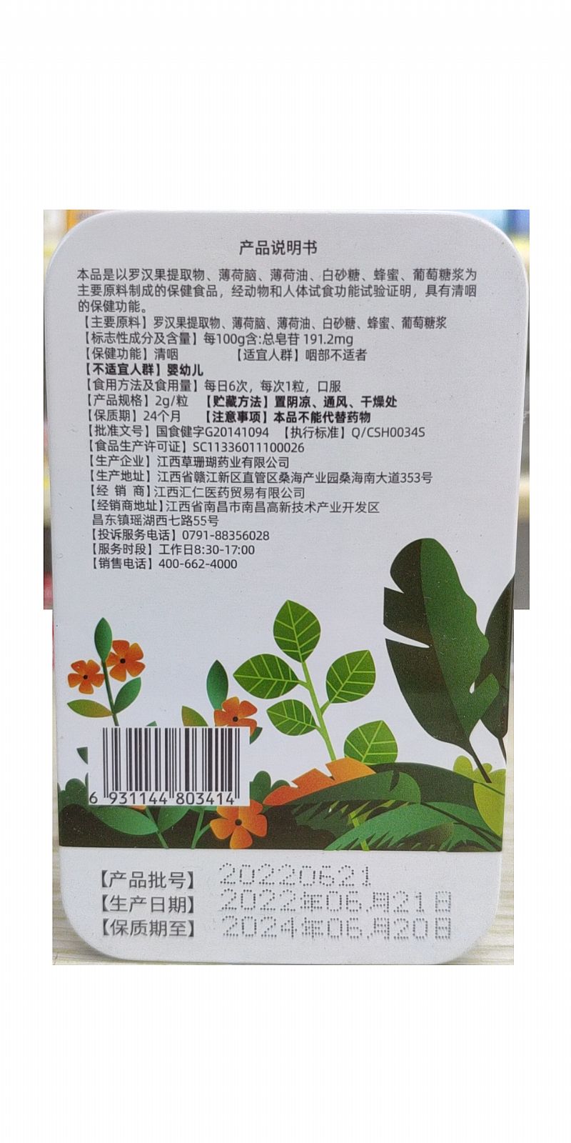 - 罗汉果提取物、薄荷脑、薄荷油、白砂糖、蜂蜜、葡萄糖浆