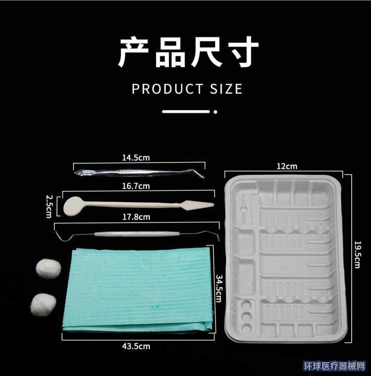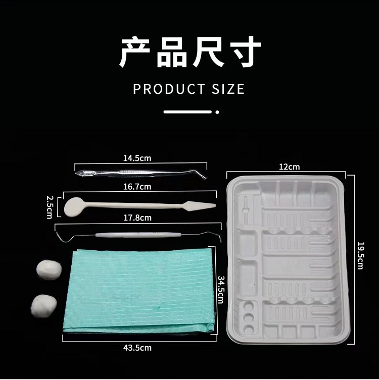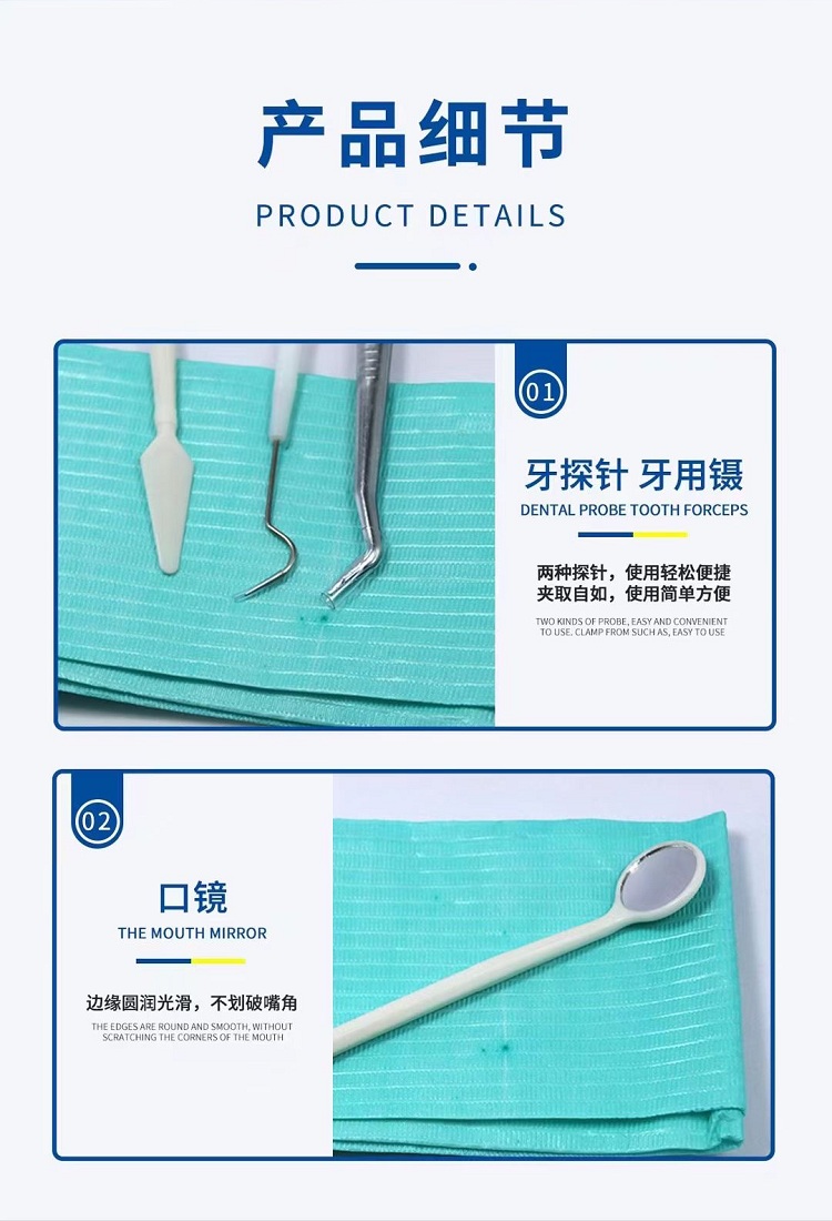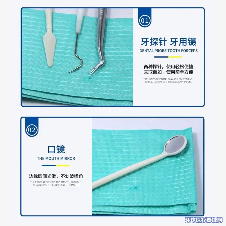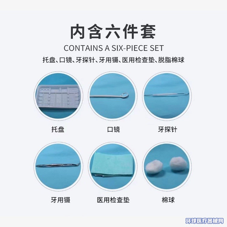 - 产品描述:通常由托盘、口镜、牙探针、牙用镊、医用检查垫、脱脂棉球、检查手套、吸唾管、水枪头组成,非无菌提供,一次性使用。口腔器械盒内各器械的产品描述见附件一中各器械的产品描述。