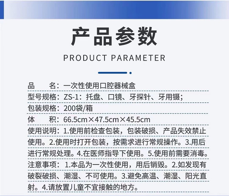 - 供口腔临床检查、治疗时使用。口腔器械盒内各器械的预期用途见附件一中各器械的预期用途。