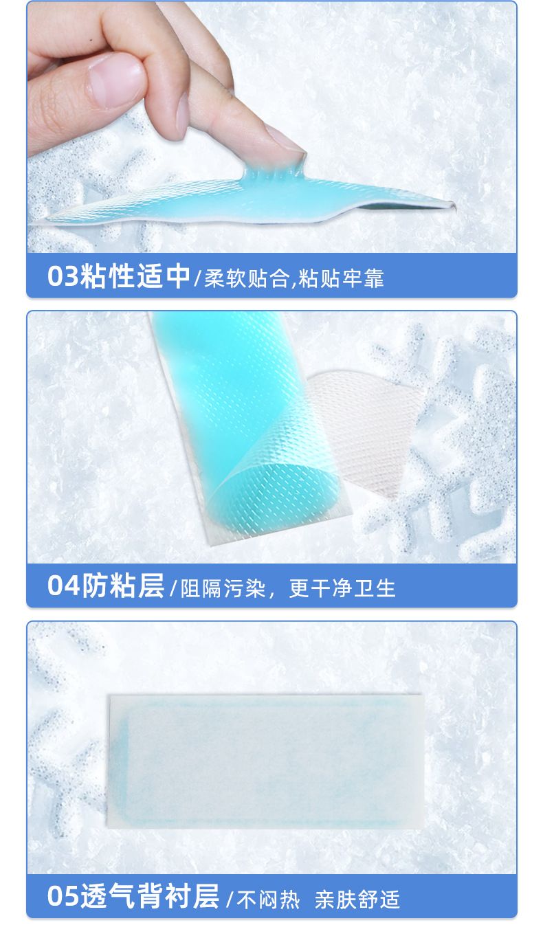 - 高分子透明凝胶:通过敏感肌肤测试,温和不刺激;亲肤凝胶,粘性好不脱胶:亲肤凝胶层,散热更快、更持久;舒适柔软:大面积弹力布:可根据实际需要适当剪裁厚再使用;独立包装,锁住有效成分;气味温和:抗过敏材料,不会对眼睛产生刺激,呵护宝宝肌肤,进口高分子凝胶基剂,轻松剥离不留胶。