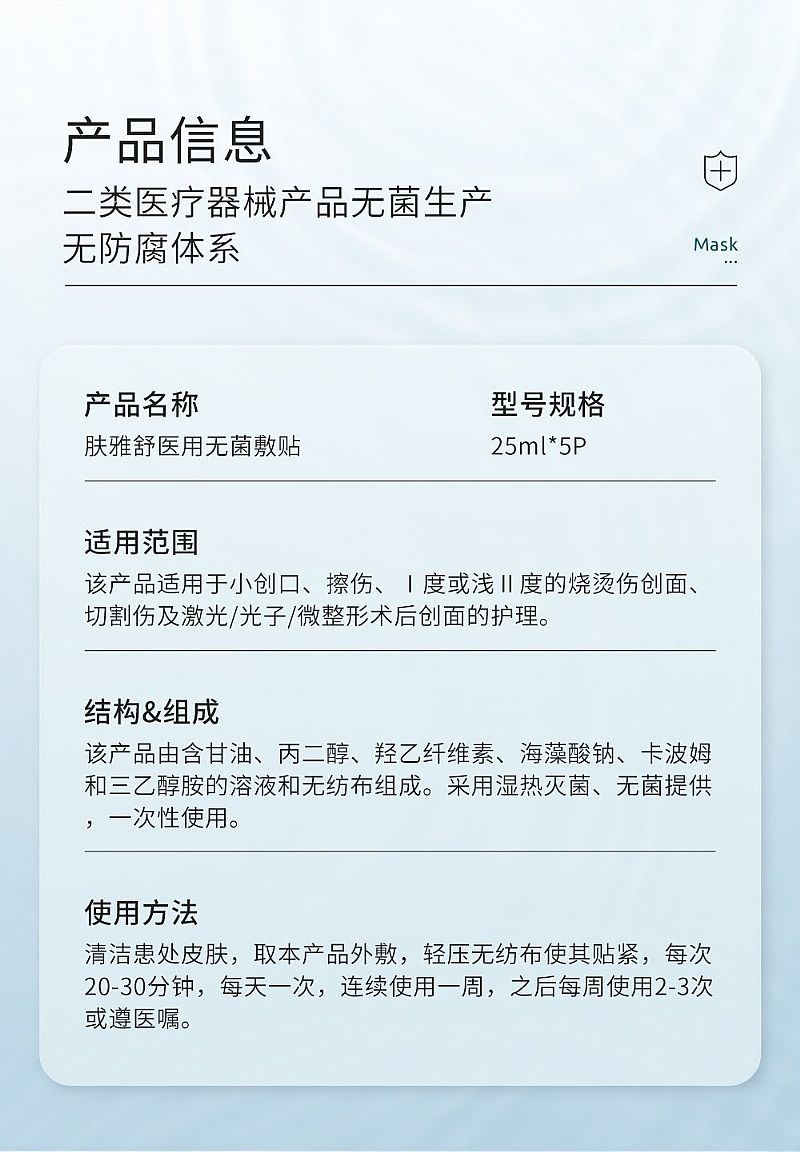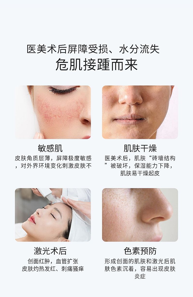- 该产品适用于小创口、擦伤、Ⅰ度或浅Ⅱ度的烧烫伤创面、切割伤及激光/光子/微整形术后创面的护理。