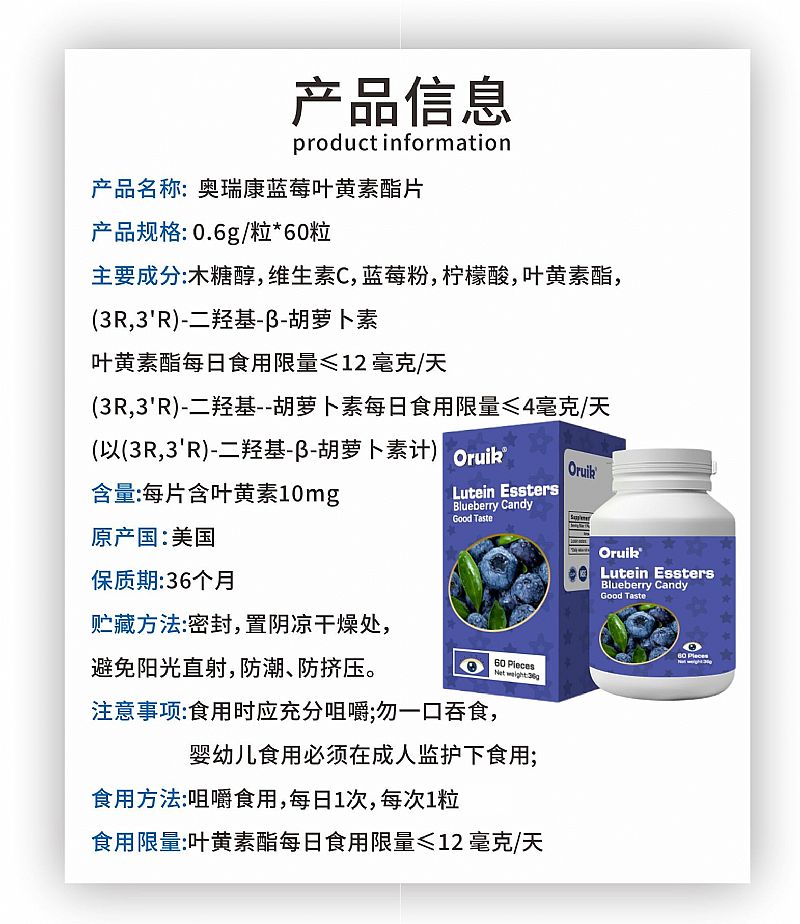 - 成分:木糖醇、维生素C、蓝莓粉、柠檬酸、叶黄素酯、胡萝卜素。