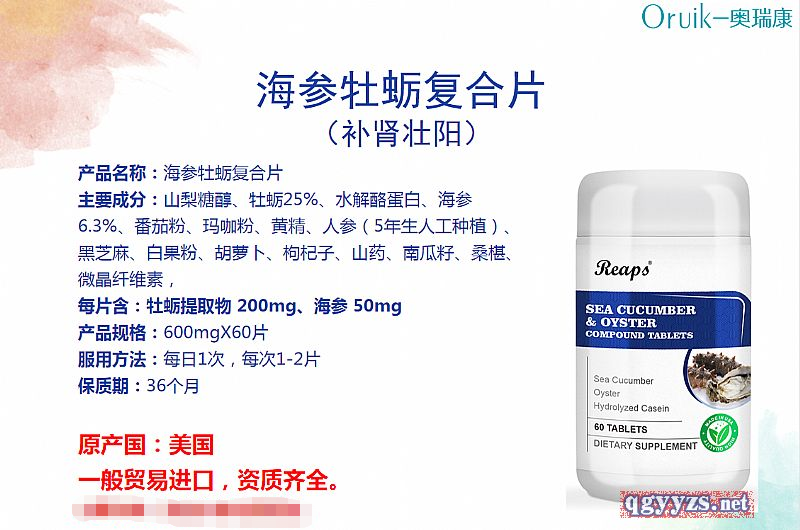 - 主要成分:山梨糖醇、牡蛎25%、水解酪蛋白、海参6.3%、番茄粉、玛咖粉、黄精、人参(5年生人工种植)、黑芝麻、白果粉、胡萝卜、枸杞子、山药、南瓜籽、桑椹、微晶纤维素,