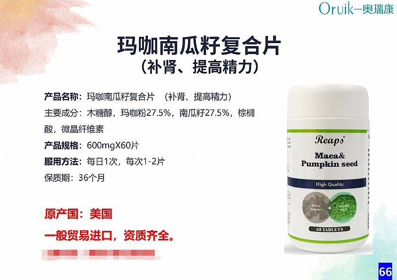 主要成分:山梨糖醇、牡蛎25*、水解酪蛋白、海参6.3*、番茄粉、玛咖粉、黄精、人参(5年生人工种植)、黑芝麻、白果粉、胡萝卜、枸杞子、山药、南瓜籽、桑椹、微晶纤维素,