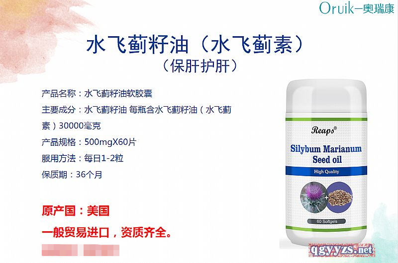 - 主要成分:水飞蓟籽油每瓶含水飞蓟籽油(水飞蓟素)30000毫克