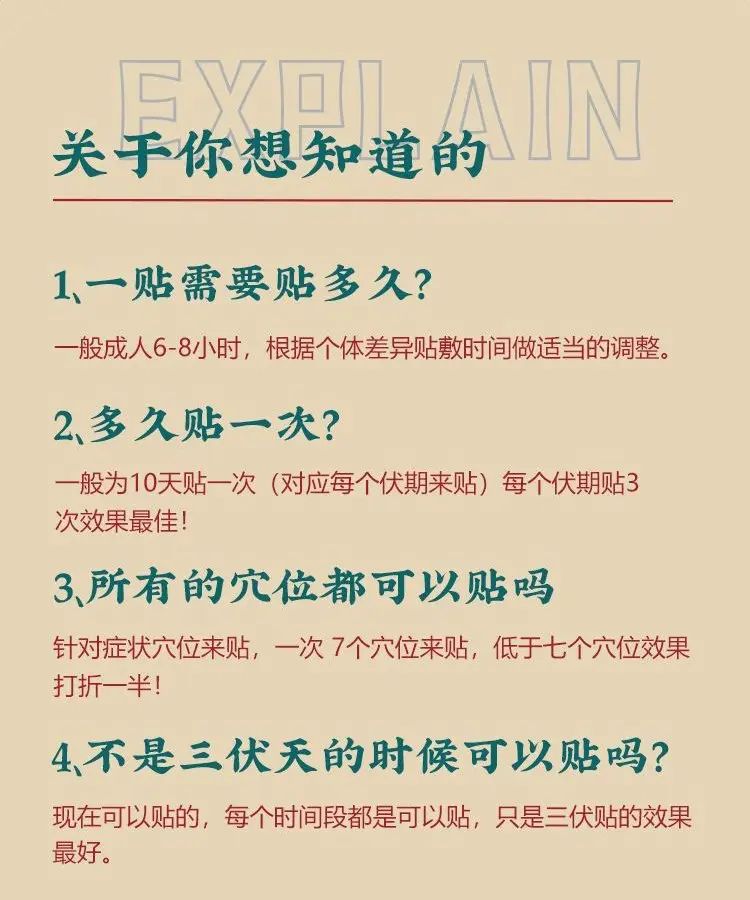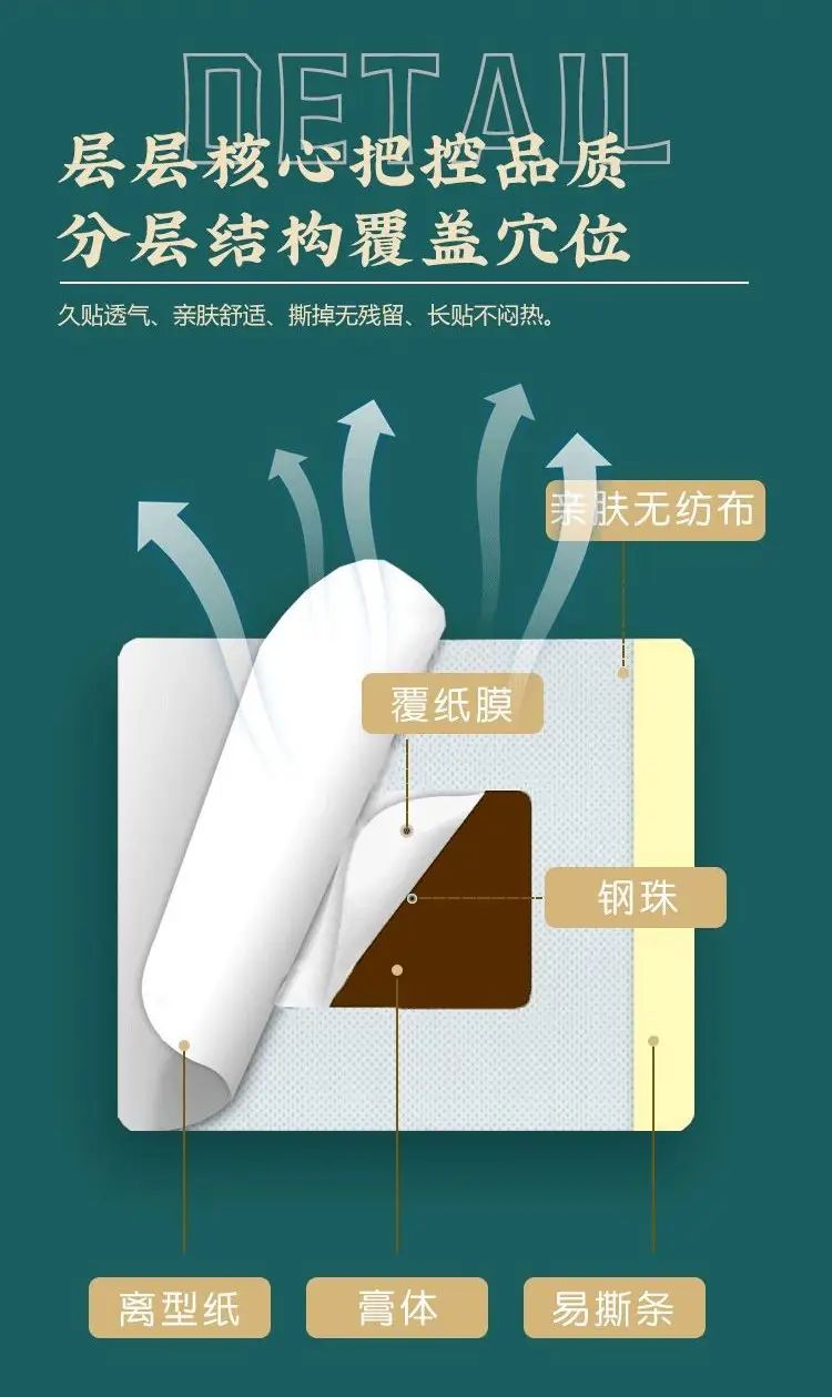 - 使用方法1、清洁相应穴位,先以拇指依次揉按相应穴位,每穴1~2**,范围由小到大,力量由轻到重,探寻敏感点。2、确认包装无破损后,打开包装,取出穴位贴敷治疗贴,将贴剂的隔离膜撕去,以钢珠对准相应穴位敏感点贴压,1片/穴、天,每日适度按压3~5次,每次3~5**,1个疗程为10天,疗程间隔2~3天。