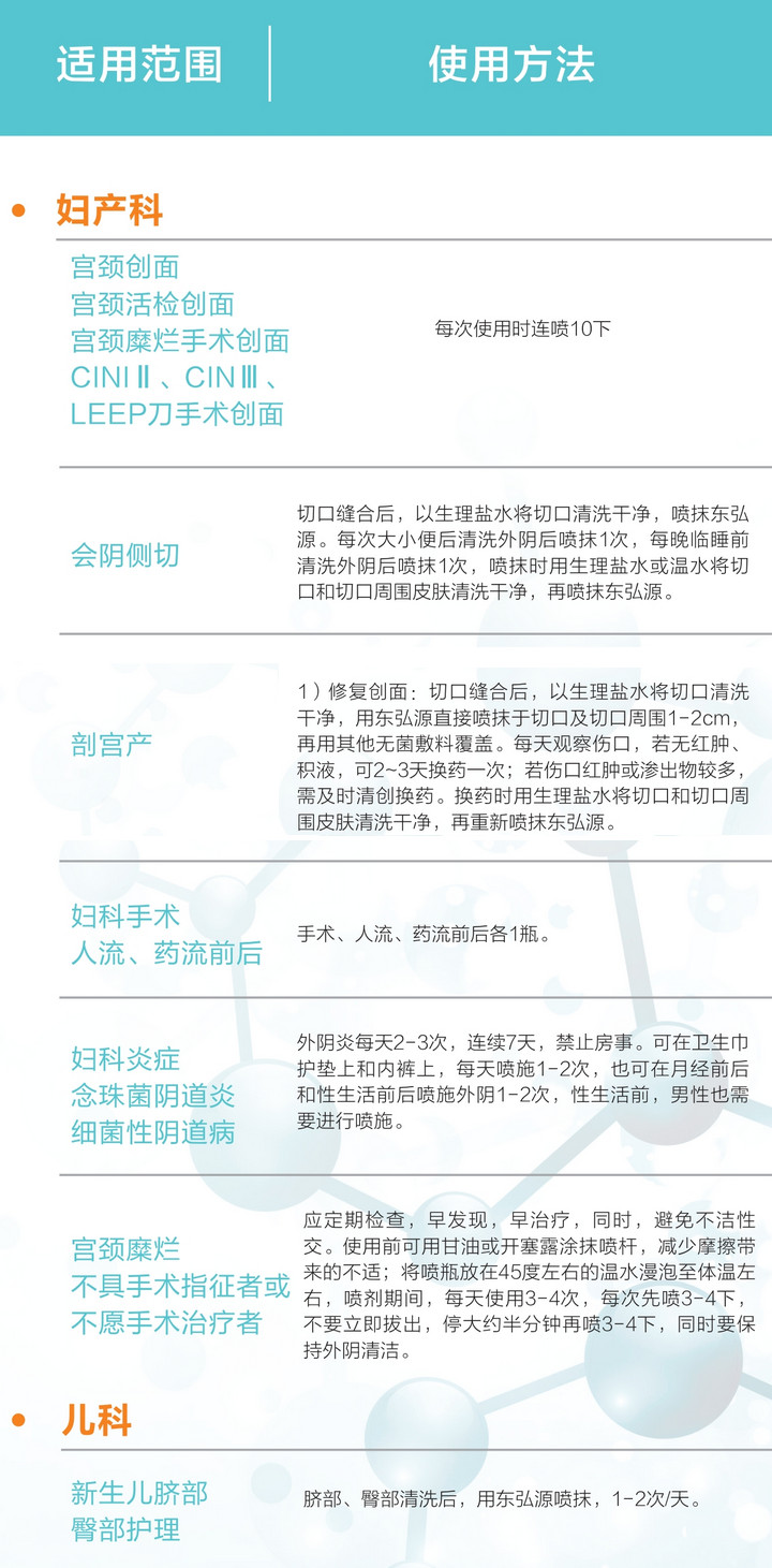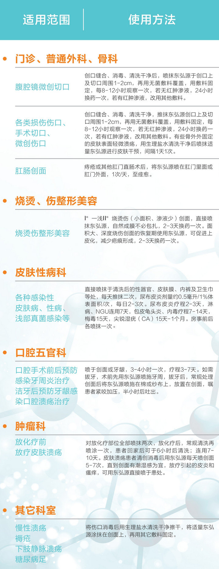 5、皮肤科、性病科:皮炎等感染性皮肤病、梅毒与尖锐湿疣等性病、浅部真菌感染等。视病情需要可同时全身应用抗生素,东弘源二类液体伤口敷料喷剂可单独外用,也可配合其它外用药联合使用。